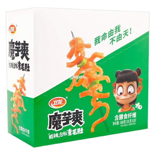 A delicious spicy konjac snacks seasoned with pickled pepper, pickled ginger, chilli oil and spices. The Endless aftertaste. Wei Long Konjac Strips Sour & Hot Flavour are the perfect snack for any occasion.