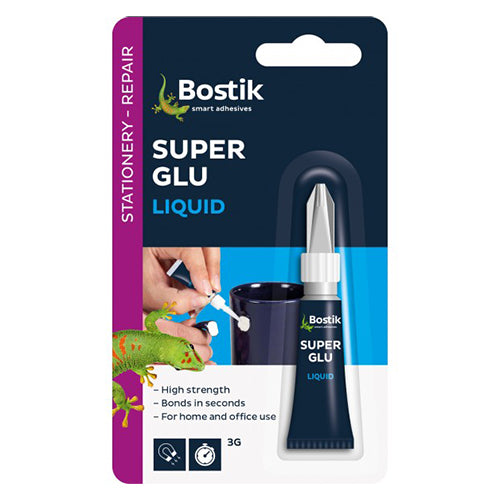 • This Bostik Super Glu bonds in seconds for strong, long lasting repairs to common household materials. It sticks to china, rubber, metal, plastics and more, and dries clear for an unobtrusive finish. This pack contains 12 tubes with 3g of glue in each.